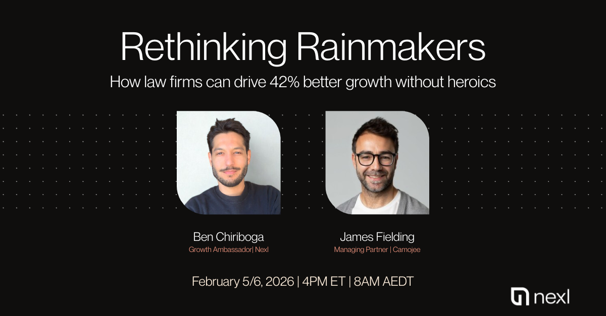 In this session, Ben Chiriboga, Growth Ambassador at Nexl, and James Fielding, Managing Partner at Camojee, walk through the key findings from our Rethinking Rainmakers report, including the four BD culture archetypes that determine how firms grow, the five operational gaps that keep most firms stuck in rainmaker dependency, and why pipeline discipline consistently outperforms individual talent as a growth lever.